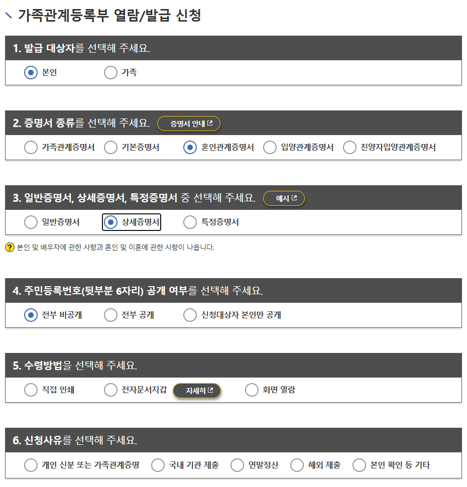 혼인관계증명서에는 일반 / 상세 / 특정 상세 세 가지 유형이 있습니다.