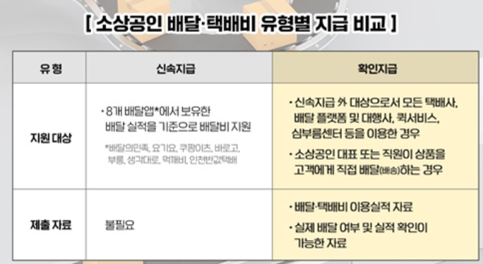 신속지급 대상은 ‘배달의민족, 요기요, 쿠팡이츠, 바로고, 부릉, 생각대로, 먹깨비, 안전반값택배’ 등 8개 주요 앱 실적 기반으로 산정되며 별도 증빙 없이도 지원됩니다. 그 외 플랫폼이나 직접 배송한 경우는 ‘확인지급’으로 분류되어 증빙자료 제출이 필요합니다.