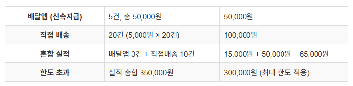 최대 지원금액은 30만 원이며, 실제 이용한 배달·택배비 실적에 따라 차등 지급됩니다. 배달앱 실적은 자동 반영되며, 직접 배송의 경우 1건당 5,000원으로 인정되어 지원금이 산정됩니다.